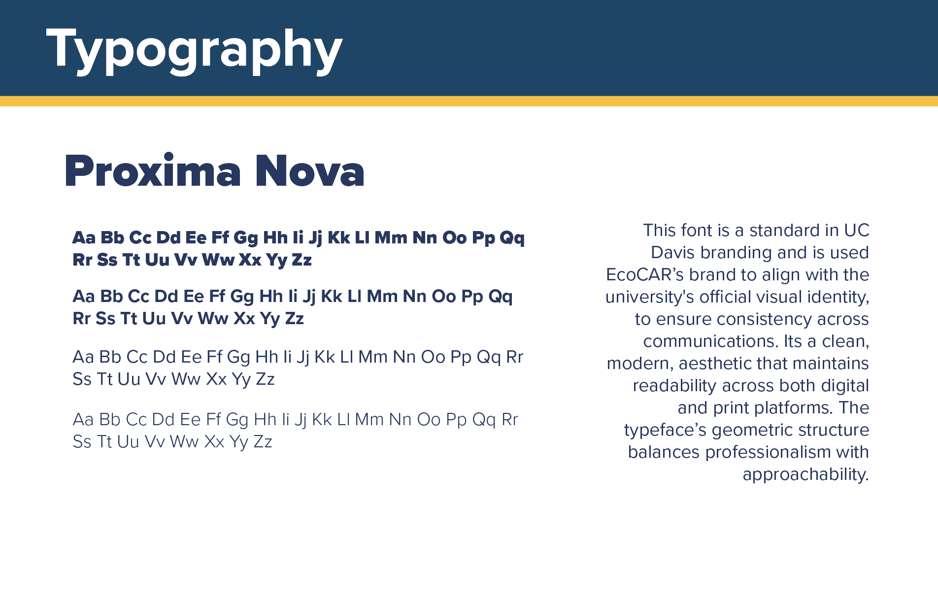 EcoCAR is a multidisciplinary engineering project that needed a cohesive visual system capable of scaling across digital and event-based touchpoints. I designed a system that balances UC Davis brand requirements, its real-world production constraints, and promotes clarity across a variety of use cases. My goal was to create a consistent visual system that could be easily applied and maintained by the multiple teams in the program.