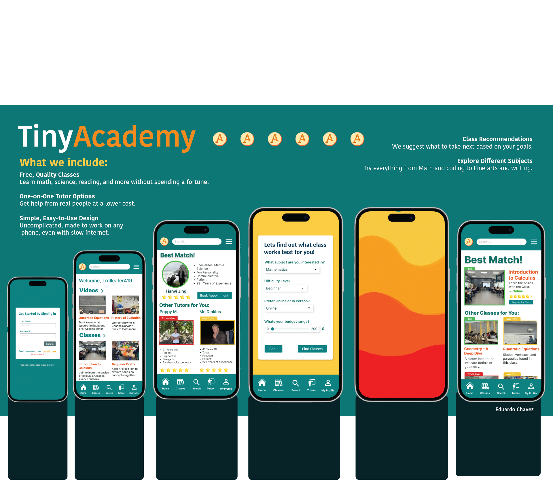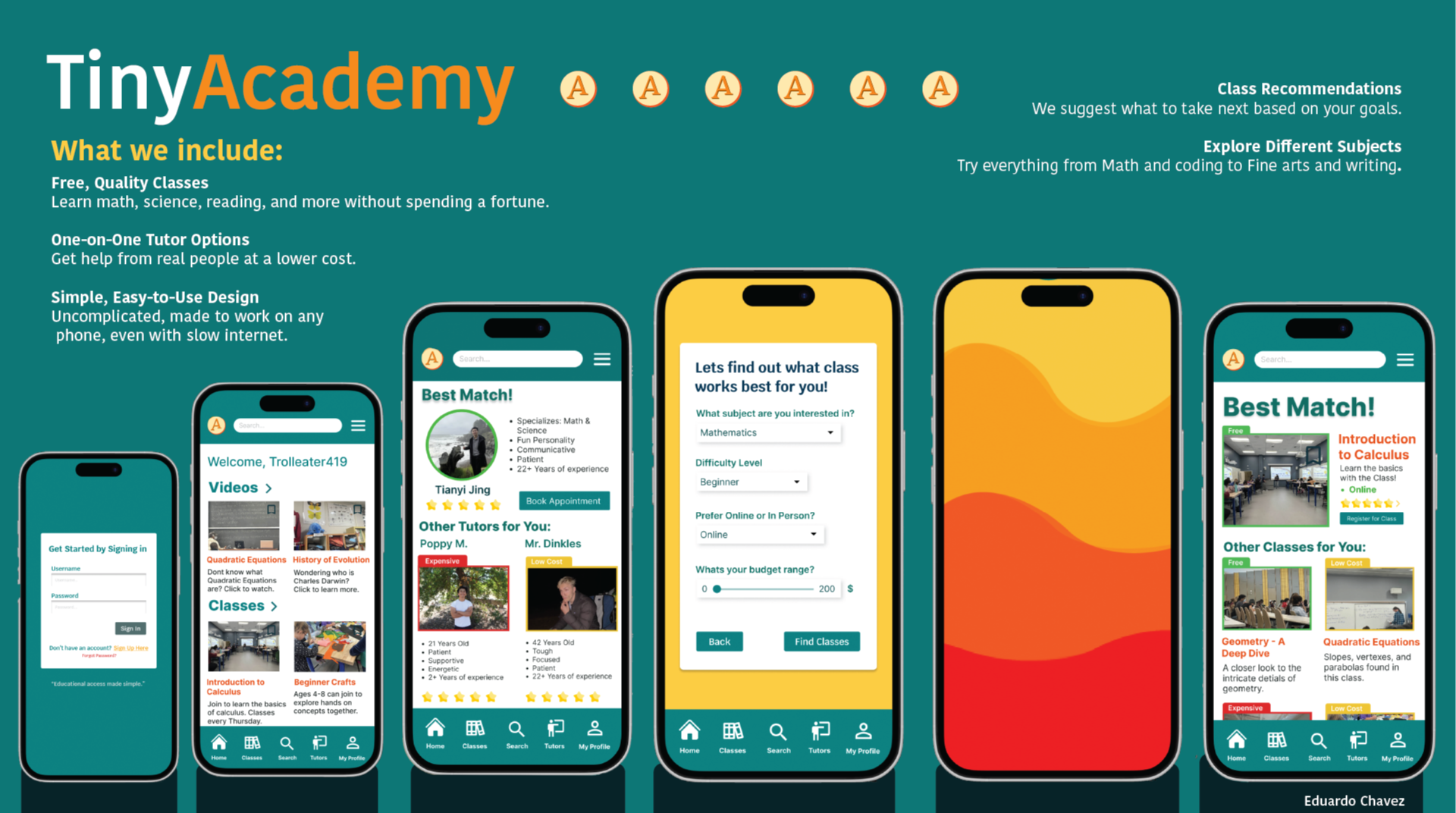 These screens represent the culmination of iterative flow design, wireframing, and refinement; prioritizing ease of navigation, clear decision-making, and approachable learning, which results in an experience that both supports quick exploration and deeper engagement.