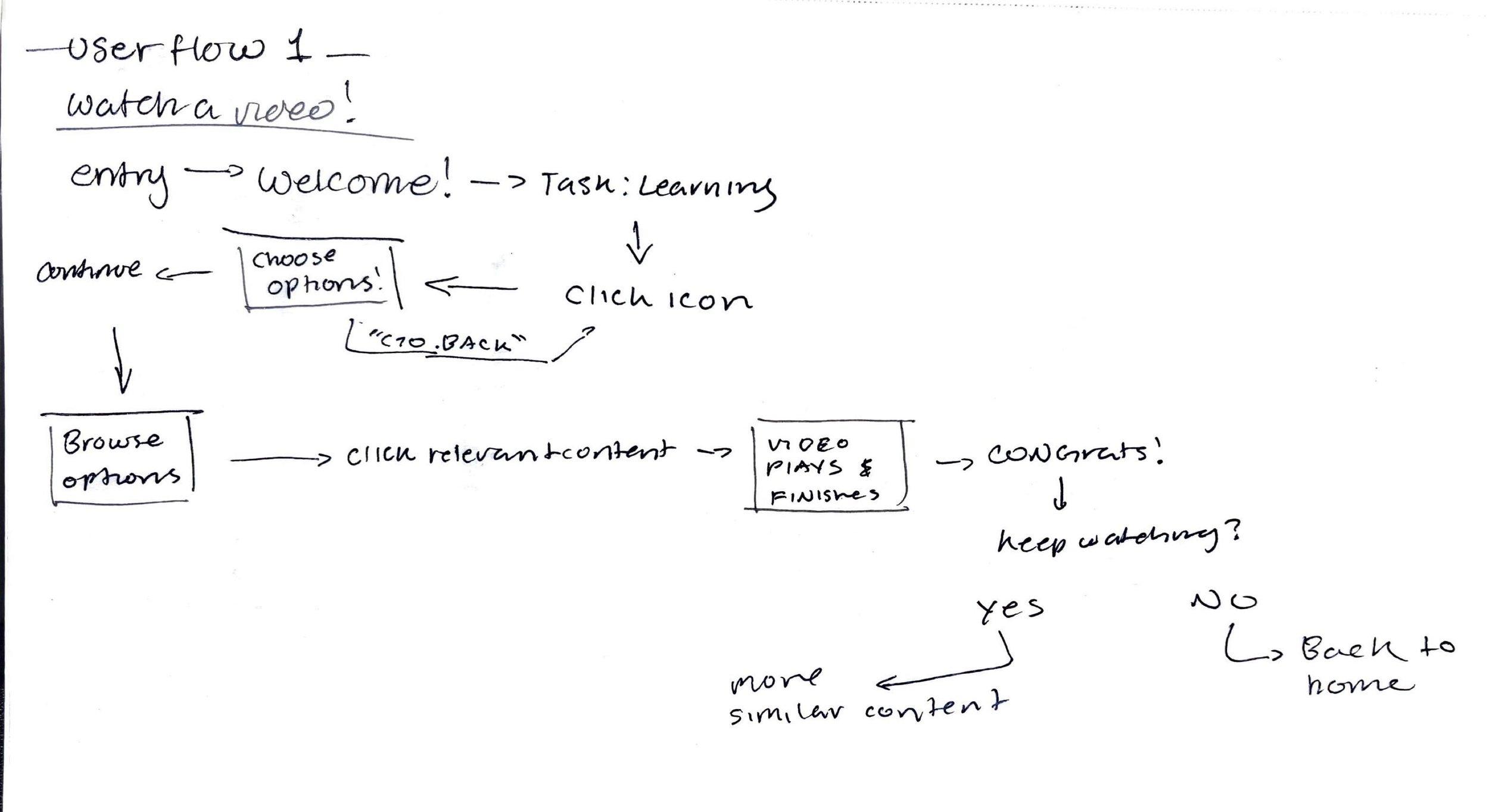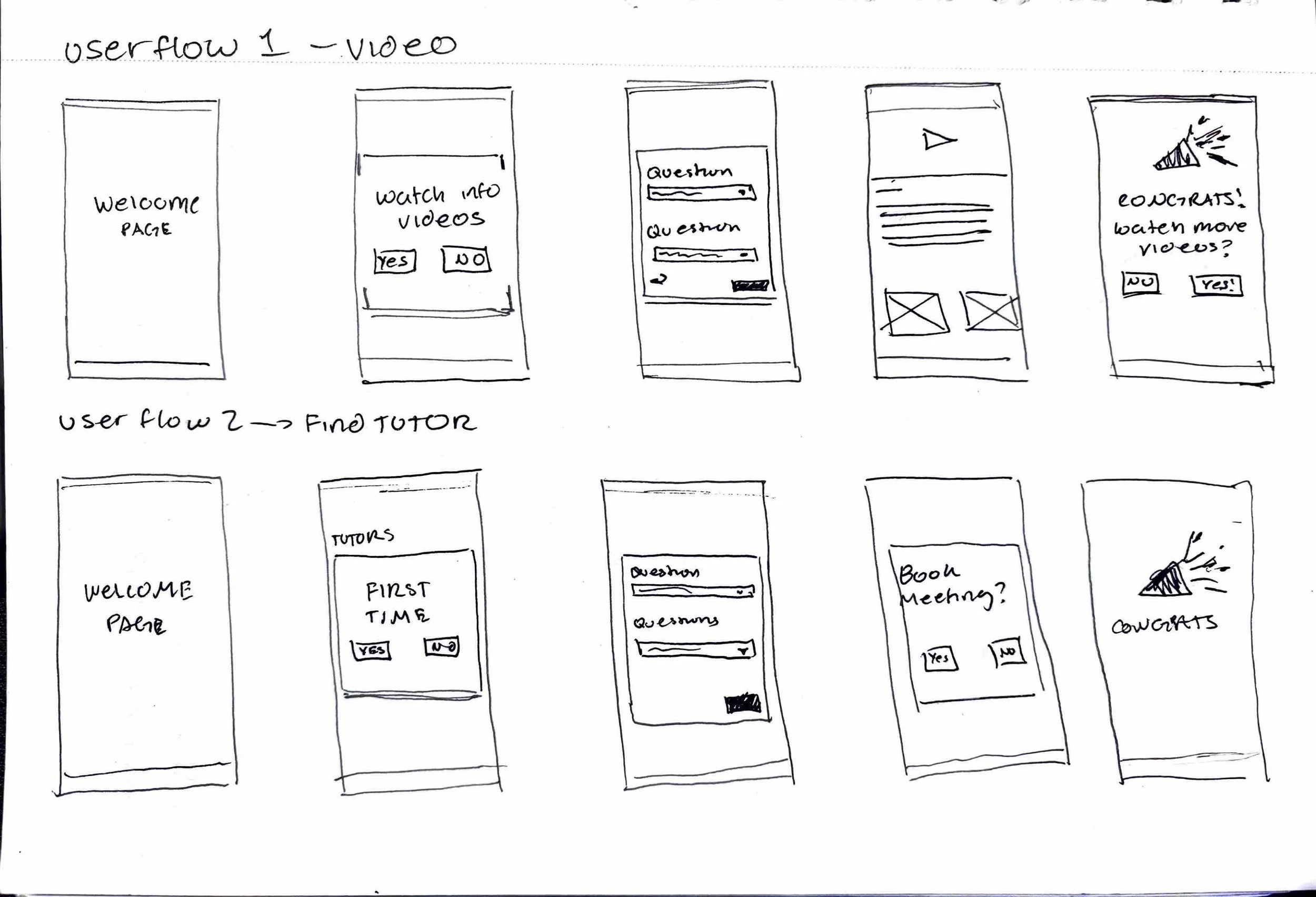 Early sketches mapping out user flows for watching videos and booking tutors.